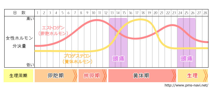 PMSとこの2つの女性ホルモンがどんなものかは、この画像とともにこちらのページPMSの症状が出る時期(発症時期)と、ホルモンバランスとの関係。PMSの原因は何?なぜ個人差があるの?で詳しくお話していますが、PMSによる頭痛は卵胞ホルモンであるエストロゲンの分泌量が大きく関わっています。