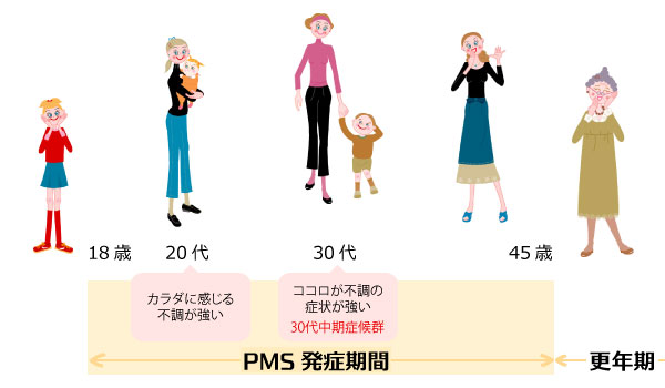 PMSは、18歳から45歳までのこの性成熟期に症状が発症し、20代のPMSの症状はカラダに感じる不調が強く、30代のPMS症状はココロの症状が強いと言われています。